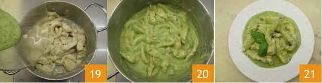 Fügen Sie auch die Zucchinicreme hinzu 19, schwenken Sie die Pfanne für etwa 5-8 Minuten, um alles zu vermischen und zu würzen. Servieren Sie das Hähnchen mit Zucchinicreme heiß mit einem Schuss Olivenöl 21.
