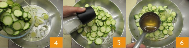 Geben Sie auch die Zucchini hinzu 4, salzen 5 und pfeffern Sie und braten Sie sie bei mittlerer Hitze für 4-5 Minuten an. Dann gießen Sie die Brühe ein 6 und lassen Sie das Ganze für 10 Minuten bei mittlerer Hitze weiterkochen.