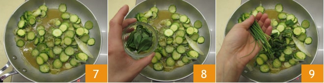 Schalten Sie die Hitze aus 7, würzen Sie mit ein paar Basilikumblättern 8 und ein paar Stängeln Schnittlauch 9