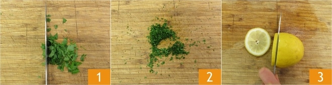 Um die Hähnchen-Piccata zuzubereiten, bereitet zunächst die Hühnerbrühe (oder Hähnchen) vor. Wascht und hackt dann die Petersilienblätter mit einem Messer 1 2. Wascht und schneidet eine halbe Zitrone in Scheiben 3