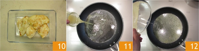 Entfernt die Brüste aus der Pfanne und legt sie beiseite 10. In derselben Pfanne die Hühnerbrühe 11 und 30 g Zitronensaft 12 hinzufügen.