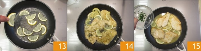 Lasst alles köcheln und legt die Zitronenscheiben hinein, kocht etwa 1 Minute 13. Gebt ebenfalls die Hähnchenbrüste hinzu 14, kocht etwa 1 Minute bei mittlerer Hitze, würzt mit Petersilie 15