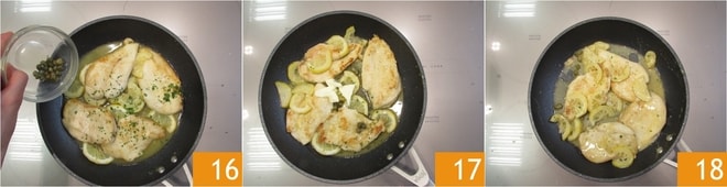 Fügt die gut abgetropften Kapern aus dem Öl hinzu 16, kocht noch eine Minute oder so lange, bis der Fond leicht eingedickt ist. Nehmt die Pfanne vom Herd und fügt die restlichen 40 g Butter in Stückchen hinzu 17, lasst sie unter Rühren schmelzen. Nach Belieben pfeffern und die Hähnchen-Piccata sofort servieren 18.