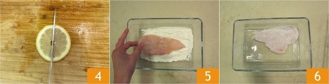 Teilt jede Scheibe in zwei 4 und legt sie beiseite. Presst die andere Hälfte der Zitrone aus und filtert den Saft. Zuletzt mehlt die Hähnchenscheiben gut ein 5 6