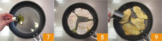 Erhitzt bei niedriger Hitze das Öl und 60 g Butter in einer Pfanne 7, legt die Hähnchenbrüste hinein und bräunt sie 8. Sobald sie gebräunt sind, salzt 9 und dreht die Hähnchenbrüste, um sie auch auf der anderen Seite zu bräunen, erneut salzen.