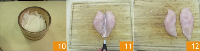 Mischen Sie von Zeit zu Zeit, bis der Reis kalt ist. Decken Sie ihn mit einem feuchten Tuch ab, damit er nicht klebt, und stellen Sie ihn beiseite 10. Machen Sie mit dem Hähnchen weiter, entfernen Sie die Knorpelstücke. Schneiden Sie die Hähnchenbrust in zwei Teile 11, um zwei dicke Filets zu erhalten 12.