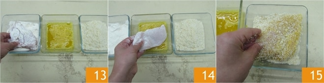 Schlagen Sie in einer Schüssel die Eier mit etwas Salz und Pfeffer. Wenden Sie die Hähnchenbrust zuerst in Mehl 13, dann im Ei 14 und schließlich im Panko 15. Machen Sie dann eine doppelte Panade, indem Sie das Hähnchen erneut im Ei und dann im Panko wenden.