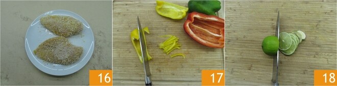 Übertragen Sie es auf einen Teller und bereiten Sie das zweite Filet auf die gleiche Weise zu. Erhitzen Sie reichlich Pflanzenöl, bis es eine Temperatur von 170 °C erreicht. Schneiden Sie inzwischen die Paprikaschoten in Streifen 17, stellen Sie sicher, dass Sie die Samen und inneren Fasern gut entfernt haben. Schneiden Sie auch die Limette in Scheiben 18.