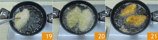Frittieren Sie die Hähnchenbrust im heißen Öl (170 °C) 19 für etwa 10 Minuten, und reduzieren Sie die Hitze, sobald die Hähnchenbrust eingetaucht ist 20. Auf diese Weise wird die Hähnchenbrust auch innen gut gar. Nach 10 Minuten sollte sie goldbraun sein 21.