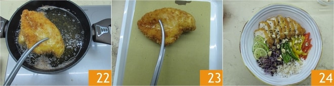 Verwenden Sie eine Zange, um das Hähnchen aus dem Öl zu nehmen 22, legen Sie es auf ein Tablett mit Küchenpapier 23 und schneiden Sie es in Scheiben. Jetzt können Sie Ihr Hähnchen-Poke zusammenstellen. Legen Sie den Reis als Basis, arrangieren Sie darauf die Paprikastreifen, die Limettenscheiben, die Radieschensprossen, gehackte Cashewnüsse und gemischte Sesamsamen. Würzen Sie mit Ponzu-Sauce und das Hähnchen-Poke ist fertig 24.