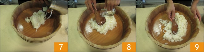 Wenn der Reis fertig ist, geben Sie ihn in einen großen Behälter, möglichst aus Holz 7. Wenn Sie einen Holzbehälter verwenden, empfehlen wir, ihn vorher mit Wasser zu befeuchten, damit das Holz den Essig nicht aufnimmt. Fügen Sie nun die Essigmischung hinzu, indem Sie sie über den Holzspatel laufen lassen 8, um sie sanfter und gleichmäßiger über den Reis zu verteilen. Mischen Sie den Reis vorsichtig mit dem Holzspatel, ohne ihn zu zerdrücken 9. Es ist wichtig, zu rühren, bis die Körner glänzend und gut gewürzt sind.