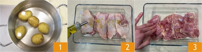 Um das Hähnchen und Püree zuzubereiten, kochen Sie zuerst die Kartoffeln in kaltem Wasser für etwa 35-40 Minuten, oder bis sie weich genug sind, um sie leicht mit einer Gabel einzustechen 1. In der Zwischenzeit nehmen Sie die Hähnchenschenkel, würzen Sie beide Seiten mit Öl 2 und Salz, und massieren Sie das Fleisch mit den Händen ein 3. Lassen Sie es 10 Minuten ruhen.