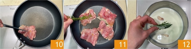 Legen Sie die Hähnchenschenkel mit der Hautseite nach unten in eine lauwarme Pfanne 10 und braten Sie sie bei mittlerer Hitze für 10 Minuten an, wobei Sie hin und wieder mit dem aromatisierten Öl bestreichen 11. Während das Hähnchen kocht, kümmern Sie sich um das Püree: Gießen Sie die Milch in einen kleinen Topf, würzen Sie mit den 2 zerdrückten Knoblauchzehen in der Schale und einigen Kräutern 12, und bringen Sie es fast zum Kochen.
