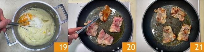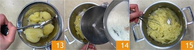 Schälen Sie die inzwischen gekochten Kartoffeln grob und passieren Sie sie noch heiß durch eine Kartoffelpresse 13. Geben Sie die Milch nach und nach durch ein Sieb hinzu 14 und rühren Sie gut mit einem Schneebesen 15; passen Sie die Menge der Milch an, je nachdem, welche Konsistenz Sie erreichen möchten.