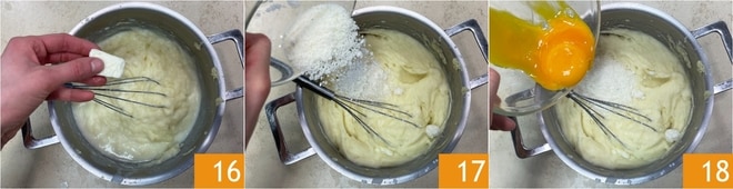 Fügen Sie nun die Butter 16, den geriebenen Parmigiano Reggiano DOP 17 und die Eigelbe 18 hinzu.