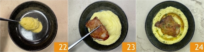 Wenn das Fleisch gar ist, können Sie anrichten: Verteilen Sie eine Schicht Püree auf dem Boden des Tellers 22 und legen Sie einen Hähnchenschenkel darauf 23. Beträufeln Sie mit dem Bratensaft, dann garnieren Sie mit Salzflocken, Pfeffer und ein paar Thymianblättern. Ihr Hähnchen und Püree ist servierfertig 24!