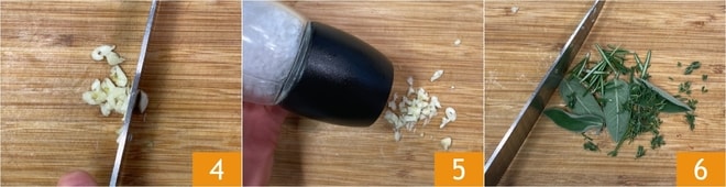 Bereiten Sie inzwischen das aromatisierte Öl vor: Hacken Sie eine Knoblauchzehe sehr fein 4, fügen Sie dann eine Prise Salz hinzu 5 und zerdrücken Sie es mit der Messerklinge, um eine Art Paste zu erhalten. Hacken Sie auch die Kräuter fein, wobei Sie einen ganzen Rosmarinzweig beiseitelegen 6.