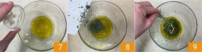 Gießen Sie das Öl in eine Schüssel, fügen Sie dann den Knoblauch 7 und die Kräuter 8 hinzu und rühren Sie mit dem Rosmarinzweig um, der zum Bestreichen des Fleisches verwendet wird 9.
