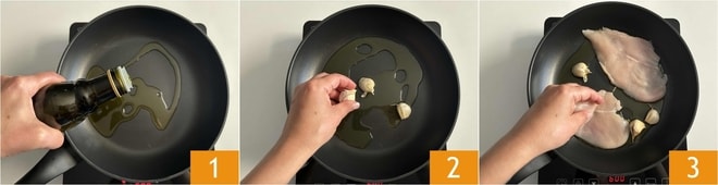 Die Hähnchenbrust in der Pfanne zuzubereiten geht sehr schnell. Zuerst erhitzen Sie eine antihaftbeschichtete Pfanne mit einem Schuss extra natives Olivenöl 1 und 2 oder 3 ungeschälten, aber zerdrückten Knoblauchzehen, damit sie ihren Geschmack abgeben, ohne zu dominant zu wirken 2. Dann legen Sie die Hähnchenbrüste hinein, wenn das Öl heiß ist 3.