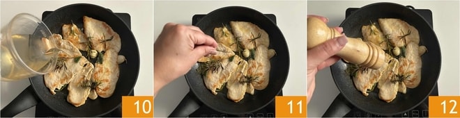 Wenn die Hähnchenbrust auf beiden Seiten goldbraun ist, löschen Sie sie mit Weißwein ab 10 und lassen Sie den Alkohol verdampfen, dann reduzieren Sie die Hitze. Würzen Sie mit Salz 11 und Pfeffer 12.