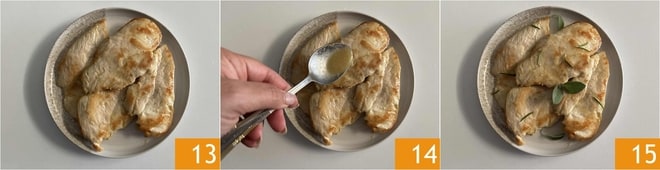 Sobald sie gar ist, legen Sie sie auf eine Servierplatte 13 und nappieren sie mit der Soße aus dem Bratensaft 14 und fügen Sie ein paar Salbeiblätter und etwas Rosmarin hinzu 15. Jetzt müssen Sie es nur noch servieren!