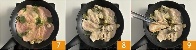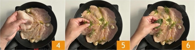 Nachdem Sie alle Hähnchenbrüste hinzugefügt haben 4, fügen Sie ein paar Zweige Rosmarin 5 und ein paar Salbeiblätter 6 hinzu.