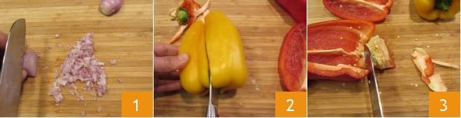 Um die Hähnchenbrust mit Paprika zuzubereiten, beginnen Sie damit, die Schalotte zu putzen und fein zu hacken 1. Waschen Sie die roten und gelben Paprika, teilen Sie sie in zwei Hälften 2, dann entfernen Sie den Stiel 3 und die inneren Kerne.