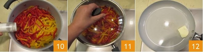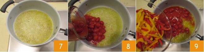 Wenn die Schalotte weich ist 7, fügen Sie die geschälten Datteltomaten 8 und die Paprikastreifen hinzu 9,