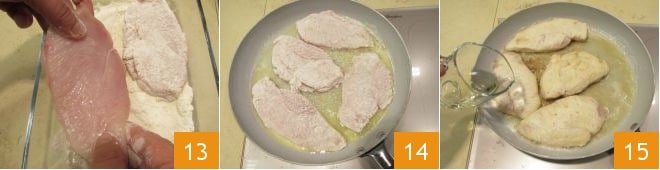 mehlen Sie die Hähnchenbrustscheiben 13, wenn die Butter zu brutzeln beginnt, legen Sie die Scheiben hinein, um sie auf beiden Seiten einige Minuten bei mittlerer Hitze anzubraten 14, dann löschen Sie mit dem Weißwein ab 15 und lassen Sie ihn verdampfen,