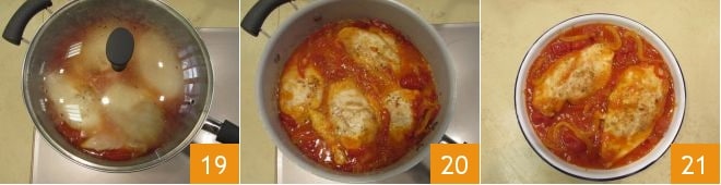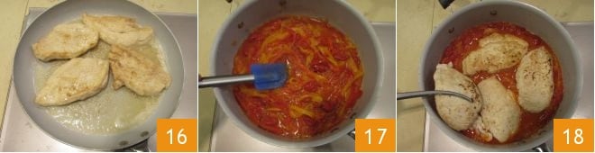 braten Sie die Hähnchenbrust kurz an, gerade genug, um das Fleisch zu bräunen 16. Wenn die Sauce aus Paprika und Datteltomaten fertig ist 17, fügen Sie die angebratenen Hähnchenbrüste hinzu 18