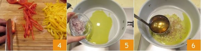 Schneiden Sie die Paprika in Streifen 4 und stellen Sie sie beiseite. Erhitzen Sie in einem großen Topf das Olivenöl, geben Sie dann die gehackte Schalotte hinzu 5, lassen Sie sie für 1 Minute anbraten, dann fügen Sie eine Kelle heißes Wasser (oder Gemüsebrühe) hinzu 6 und lassen Sie sie weitere 3 Minuten bei schwacher Hitze schmoren.