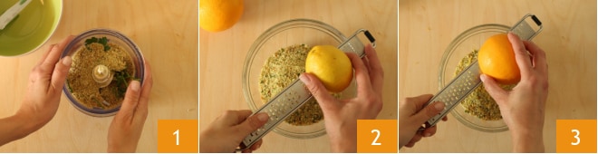 Um die Hähnchenrouladen mit Lauch und Zitrusfrüchten zuzubereiten, kümmern Sie sich zuerst um die Füllung. Geben Sie die Semmelbrösel, eine Prise Salz, eine Prise Pfeffer, die Petersilie und den geschälten Knoblauch 1 in den Behälter eines Mixers. Mixen Sie alles und geben Sie es in eine Schüssel, fügen Sie die Schale einer halben Zitrone 2 und die einer halben Orange hinzu 3.