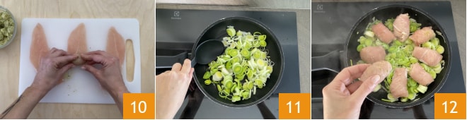 Dann rollen Sie sie, um die Rouladen zu formen 10. Erhitzen Sie das Öl in einem Topf, fügen Sie den Lauch hinzu und lassen Sie ihn bei schwacher Hitze einige Minuten lang weich werden 11. Erhöhen Sie dann die Hitze, legen Sie die Rouladen mit der Naht nach unten 12.