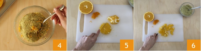 Vermischen Sie alles 4 und stellen Sie es kurz zur Seite. Reiben Sie die restliche Zitronenschale und die Orangenschale ab und heben Sie sie für die Dekoration auf. Schneiden Sie die Orange in der Mitte durch und schälen Sie sie 5, dann würfeln Sie sie 6.