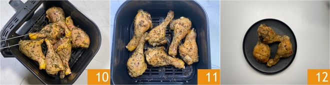 Legen Sie die Keulen in den Korb der Heißluftfritteuse, ohne sie zu stapeln (wir haben eine Heißluftfritteuse mit einem Fassungsvermögen von etwa 6 Litern verwendet) 10. Garen Sie sie bei 190° für 35 Minuten, bis sie gut gebräunt sind 11. Um die Garstufe zu überprüfen, stechen Sie die Keulen mit einer Gabel an: Wenn die austretende Flüssigkeit klar ist, sind sie gut gegart, aber noch saftig. Wenn die Flüssigkeit rosa ist, benötigen sie noch ein paar Minuten Garzeit. Servieren Sie Ihre Hähnchenkeulen in der Heißluftfritteuse sofort 12!