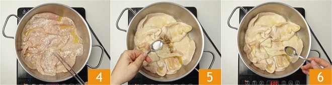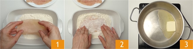 Um die Hähnchenschnitzel mit Zitrone zuzubereiten, besorgen Sie sich dünne Hähnchenbrustscheiben (etwa einen halben cm dick); wenn sie zu dick sind, können Sie sie mit einem Fleischklopfer zwischen zwei Blatt Backpapier flach klopfen. Wenden Sie die Hähnchenscheiben in Mehl 1, um sie gut auf beiden Seiten zu bedecken 2. Pressen Sie den Zitronensaft aus und stellen Sie ihn beiseite. Lassen Sie die Butter in einem großen Topf bei niedriger Hitze schmelzen 3.