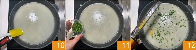 R fchren Sie und lassen Sie die Sauce bei schwacher Hitze einkochen, bis die gew fcnschte Konsistenz erreicht ist 10, verfeinern Sie sie dann mit gehackter Petersilie 11 und Zitronenschale 12.
