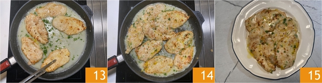 Geben Sie die H e4hnchenscheiben wieder in die Pfanne zur warmen Sauce 13 und mischen Sie vorsichtig, damit sie Geschmack aufnehmen 14. Servieren Sie Ihre Zitronen-H e4hnchenscaloppine sofort 15!