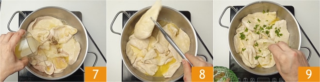 Begießen Sie mit dem Zitronensaft 7. Lassen Sie die Schnitzel gut aufsaugen, indem Sie sie ab und zu wenden 8. Es dauert etwa 12 Minuten bei niedriger Hitze, wobei darauf zu achten ist, dass der Saft nicht zu stark austrocknet. In diesem Fall können Sie ein halbes Glas Wasser bei Raumtemperatur hinzufügen. Zum Schluss mit frisch gehackter Petersilie würzen 9. Servieren Sie die Hähnchenschnitzel mit Zitrone heiß, überzogen mit ihrem Kochfond.