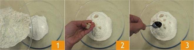 Um die Pita zuzubereiten, mischt das Manitoba-Mehl und das 00-Mehl in einer Schüssel 1, fügt dann die zerbröckelte frische Hefe 2 und das Malz 3 hinzu.