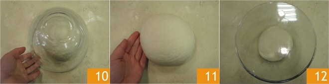 Wenn das Öl vollständig absorbiert ist, deckt den Teig mit der Schüssel ab und lasst ihn 10 Minuten ruhen 10. Nach dieser Zeit faltet den Teig ein paar Mal, um ihn zu stärken, formt dann eine Kugel 11 und legt sie in die Schüssel, die ihr mit etwas Öl eingefettet habt. Deckt sie mit Frischhaltefolie ab und lasst sie bei Raumtemperatur ca. 2 Stunden gehen oder bis der Teig das dreifache Volumen erreicht hat 12.