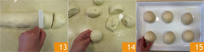 Sobald der Teig gegangen ist, übertragt ihn auf die leicht bemehlte Arbeitsfläche, formt eine Rolle und teilt sie in 6 Portionen zu je 140 g 13. Formt jede Teigportion zu einer Kugel 14 und legt sie mit Abstand auf ein mit etwas Öl eingefettetes Blech 15. Deckt sie mit Frischhaltefolie ab und lasst sie eine weitere Stunde gehen.