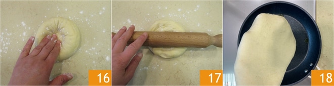 Nach dieser Zeit rollt die Kugeln auf der leicht bemehlten Arbeitsfläche aus, um Scheiben mit einem Durchmesser von ca. 20 cm zu erhalten; verwendet zunächst die Hände 16 und dann das Nudelholz, um die Dicke zu vereinheitlichen 17. Ihr seid bereit zum Kochen: Erhitzt eine beschichtete Pfanne mit etwas Öl gut, dann legt die Pita hinein 18.