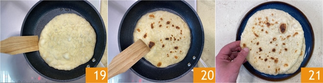 Kocht sie bei mäßiger Hitze, bis die ersten Blasen auf der Oberfläche erscheinen 19, dreht sie dann um und lasst sie auch auf der anderen Seite goldbraun werden 20. Sobald sie fertig sind, stapelt die Pitas eine auf die andere 21 und deckt sie mit einem Tuch ab; so bleiben sie weich.