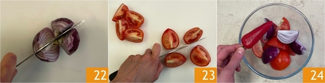 Um die Hähnchenspieße zuzubereiten, beginnt mit der Marinade: Schält und schneidet die Zwiebel in 4 Teile 22, macht dasselbe mit den Tomaten 23. Gebt Zwiebeln und Tomaten zusammen mit der ganzen Chili in eine Schüssel 24.