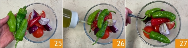Fügt auch die ganzen Bratpaprika hinzu 25 und etwas Öl 26, dann mischt gut, um das Gemüse gleichmäßig zu würzen 27.