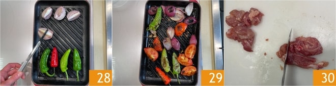 Legt das Gemüse auf einen gut beheizten Grill 28 und röstet es, indem ihr es gelegentlich mit einer Küchenzange wendet 29. In der Zwischenzeit schneidet die Hähnchenschenkel in kleine Stücke und stellt sie beiseite 30.