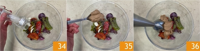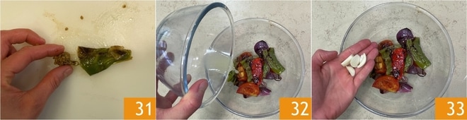 Wenn das Gemüse geröstet ist, nehmt die Bratpaprika und entfernt das Ende und die inneren Samen 31, macht dasselbe mit der Chili. Gebt das Gemüse zurück in die Schüssel und gießt den Limettensaft dazu 32, dann fügt die geschälte Knoblauchzehe hinzu 33.