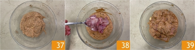 Ihr erhaltet eine eher grobe Mischung 37. An diesem Punkt gebt das Hähnchen in die Schüssel 38 und mischt gut, sodass die Stücke gleichmäßig bedeckt sind. Deckt mit Frischhaltefolie ab und lasst es im Kühlschrank mindestens eine Stunde oder besser über Nacht marinieren 39.