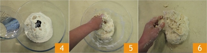 Gießt auch das Wasser dazu 4 und fangt an zu kneten, zuerst in der Schüssel 5 und dann auf der Arbeitsfläche 6.